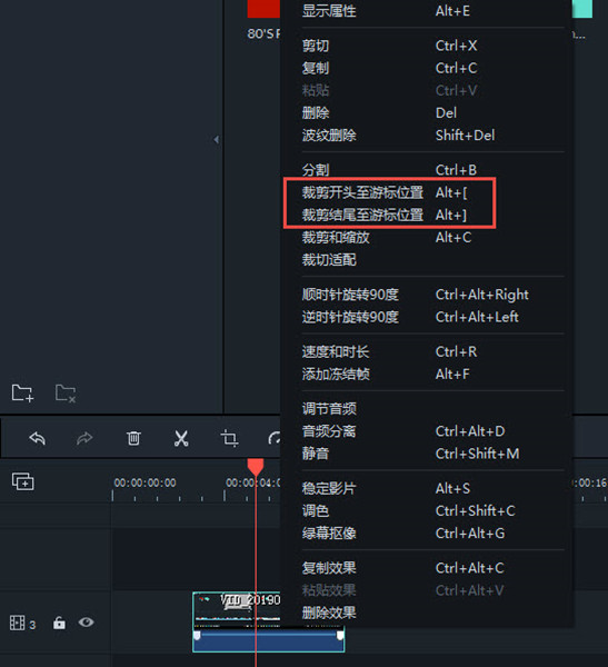 3、您也可以從視頻片段的開頭或結(jié)尾“快速裁剪”。 在時間軸中,將游標(biāo)放在要裁剪的幀上,右鍵單擊片段,選擇“裁剪開頭至游標(biāo)位置”或“裁剪結(jié)尾至游標(biāo)位置”,具體取決于您是要刪除游標(biāo)后面還是前面的內(nèi)容。