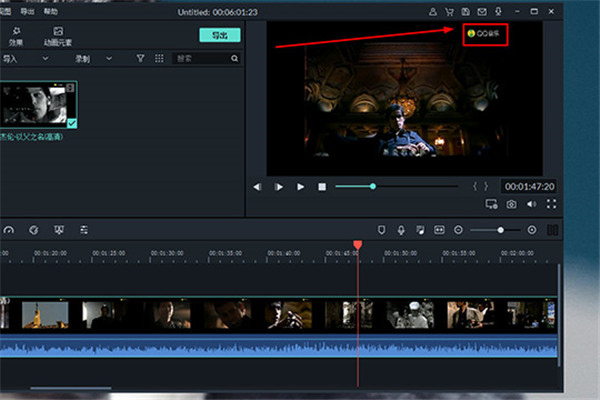1、打開想要去水印的視頻文件,并將打開的視頻拖動到下方的時間軸中,之后在右上角的播放窗口進(jìn)行播放,尋找水印的具體位置,像小編所使用的視頻就是從QQ音樂中進(jìn)行下載的,在QQ音樂中上下載的視頻都自帶了水印標(biāo)志,如下圖所示: