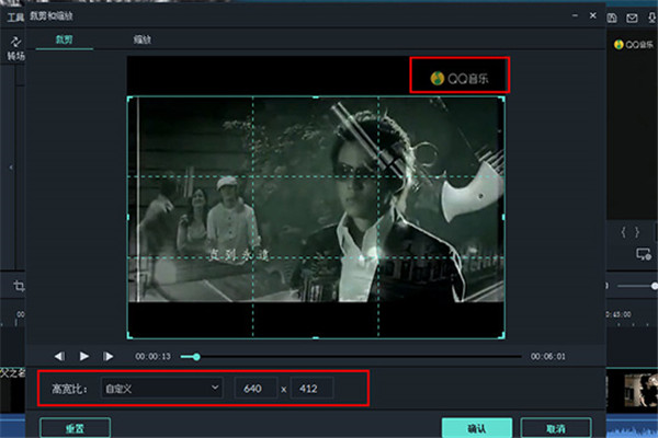 3、彈出裁剪和縮放的界面后,由于軟件默認(rèn)的高寬比是原始比例,不管怎么調(diào)整都是保持縱橫比例的,所以需要將高寬比設(shè)置為自定義,并調(diào)整圖中淺藍(lán)色的框,使水印部分排除在選框之外,這樣裁剪后的視頻將不再出現(xiàn)水印部分,如下圖所示: