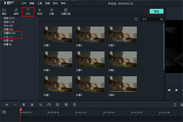 3、在左上角的欄目中選擇“文字”功能欄,其中的“字幕”功能就是我們今天所說的主角,“字幕條”指的是字幕周圍那一圈的特效,用戶可以在添加完字幕后再利用此功能添加自己需要的效果,在這里直接點擊“字幕”功能,選擇合適的字幕,你也可以點擊單個字幕中的“+”號添加多個一樣的字幕,如下圖所示: