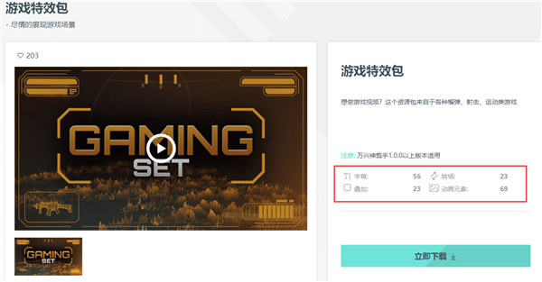 1、資源商城里的每一個資源包基本都是由文字,轉(zhuǎn)場,濾鏡,動畫元素等組成,不同的特效包組成會有所不同。您可以通過在每個資源包的詳情頁上進(jìn)行查看并確認(rèn)資源包所包含的特效資源以及數(shù)量,例如游戲特效包就分別包含了56個字幕,23個轉(zhuǎn)場,23個疊加以及69個動畫元素。