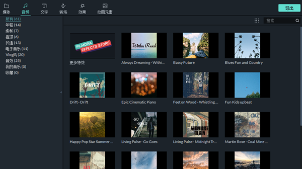 音頻庫有50多首首歌曲,音樂類型涵蓋:年輕,柔和,搖滾,民謠,電子音樂等等,還有很多豐富的音效。