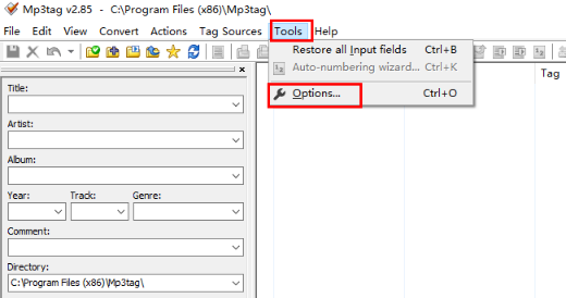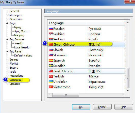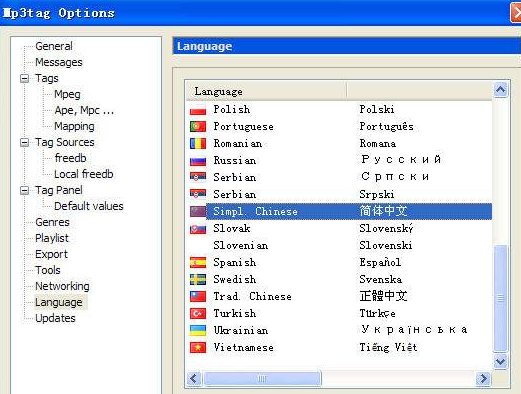 如何設(shè)置mp3Tag的中文語(yǔ)言?【Tools】→【Options】會(huì)彈出設(shè)置窗口 →【Language】→選擇【Simpl.Chinese】(簡(jiǎn)體中文)