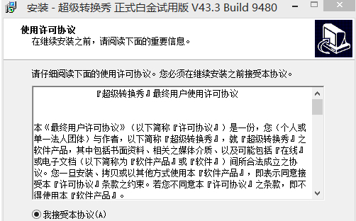 2.接下來將跳轉(zhuǎn)的是超級(jí)轉(zhuǎn)換秀安裝協(xié)議界面截圖:在該界面里需要小伙伴大致閱讀超級(jí)轉(zhuǎn)換秀軟件的安裝協(xié)議(建議此處不要直接跳過,如選擇跳過就被視為是同意該協(xié)議),閱讀后可單擊【下一步】按鈕繼續(xù)安裝;