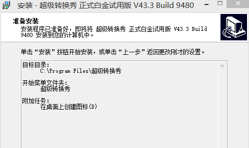 6.以上都設(shè)置完畢后將跳轉(zhuǎn)至確認(rèn)超級(jí)轉(zhuǎn)換秀安裝信息界面,如下圖:在該界面我們可以看到自己之前已經(jīng)設(shè)置過的信息,確認(rèn)無誤后我們就可以單擊【下一步】按鈕繼續(xù)最后的安裝了;
