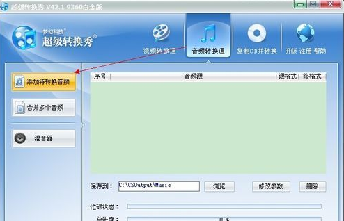 1.首先找到已經(jīng)安裝好的超級(jí)轉(zhuǎn)換秀,雙擊程序打開。如下是打開后的軟件界面截圖:根據(jù)圖中提示我們需要先找到【音頻轉(zhuǎn)換】點(diǎn)開后找到【添加待轉(zhuǎn)換音頻】。