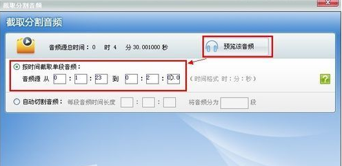3.接下來我們就需要設(shè)置需要剪切的音頻時(shí)間段,從幾秒開始到多少秒(試用版最長60秒)?;蛘咝』锇閭儚谋镜夭シ牌魈幭茸龊霉P記音樂要從多少秒開始到多少秒結(jié)束。