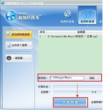 4.跳轉(zhuǎn)至以下界面時(shí)我們需要設(shè)置需要將轉(zhuǎn)換好的音頻存儲(chǔ)到哪里,然后我們就可以單擊【開始轉(zhuǎn)換】按鈕開始轉(zhuǎn)換。