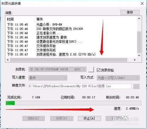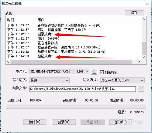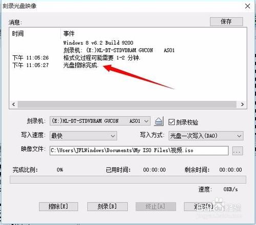 6、找到剛剛創(chuàng)建的ISO文件,右擊ISO 文件然后鼠標(biāo)移動(dòng)到UltraISO點(diǎn)擊刻錄光盤(pán)(或者是右擊ISO文件用UltraISO打開(kāi)再點(diǎn)擊中間的刻錄光盤(pán)的圖標(biāo)),之后在刻錄的時(shí)候先點(diǎn)擊擦除(相當(dāng)于格式化光盤(pán),如果不先擦除則會(huì)提示這個(gè)光盤(pán)有數(shù)據(jù))再點(diǎn)擊將刻錄校驗(yàn)選勾(刻錄校驗(yàn)是為了保證刻錄結(jié)果的完整性),然后點(diǎn)擊刻錄,這時(shí)只要等待片刻即可刻錄完成。