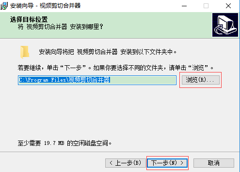 二、開始安裝后進入到視頻剪切合并器的安裝路徑設置界面,在這個界面里我們需要設置視頻剪切合并器安裝文件的具體目錄,請單擊【瀏覽】開始設置。