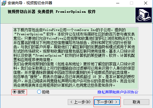 三、設置完視頻剪切合并器安裝路徑后進入到視頻剪切合并器的安裝協(xié)議界面,在這個界面里請你先閱讀了解協(xié)議內(nèi)容再繼續(xù)安裝。同意協(xié)議請勾選“接受”在單擊【下一步】