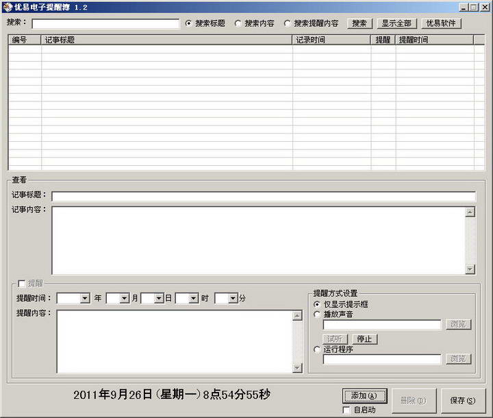 優(yōu)易電子提醒簿是一款電腦提醒軟件。很多人一天事情太多,往往都會遺忘1~2件。優(yōu)易電子提醒簿可以輕松幫你解決這項(xiàng)問題,還支持鬧鐘音樂設(shè)置,歡迎下載。