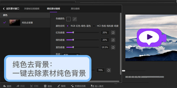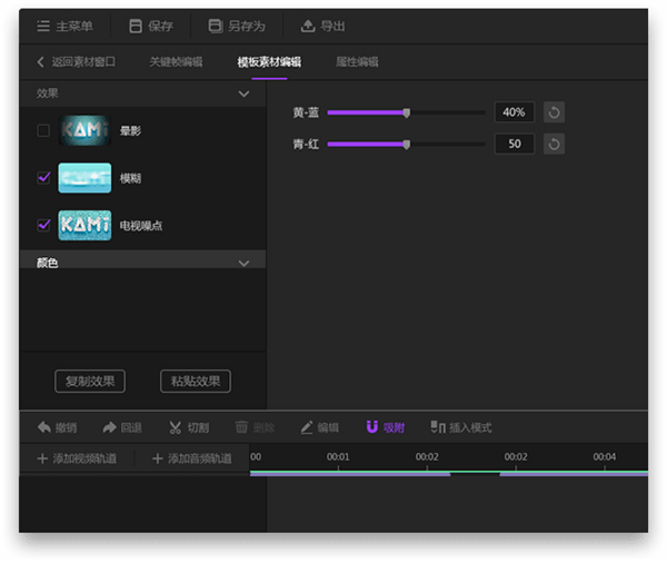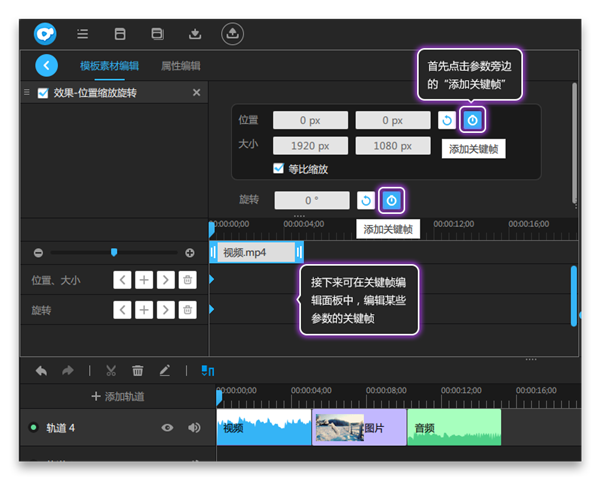 3、接下來講講詳細使用關(guān)鍵幀的步驟,需要使用效果或顏色的某些參數(shù)的關(guān)鍵幀時,首先要在模板素材編輯面板中,點擊參數(shù)旁邊的“添加關(guān)鍵幀”按鈕,接下來可在關(guān)鍵幀編輯面板中,編輯某些參數(shù)的關(guān)鍵幀。