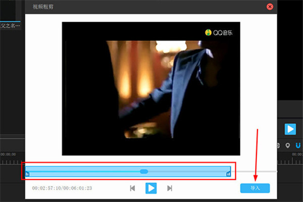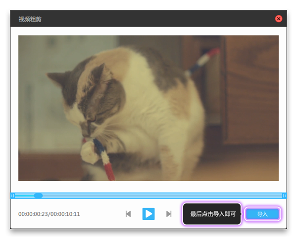 2、不管是視頻還是音頻文件,在導(dǎo)入時都會彈出視頻粗剪的界面,用戶可以在下方的播放進度調(diào)節(jié)文件總的播放長度,最好是點擊“播放”從頭到尾播放一變,讓你及時發(fā)現(xiàn)視頻中的片頭或片尾的瑕疵部分,這樣就可以對其進行調(diào)整了,最后點擊“導(dǎo)入”選項即可導(dǎo)入素材,如下圖所示: