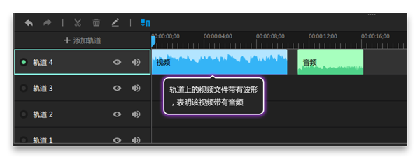 1、觀察軌道上的視頻、音頻文件,可以看到軌道上的視頻文件,和音頻文件一樣帶有波形,表明該視頻帶有音頻,如圖所示:
