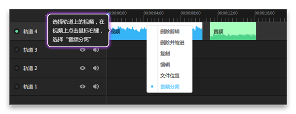 2、選擇軌道上的視頻,在視頻上點擊鼠標右鍵,選擇“音頻分離”,如圖所示: