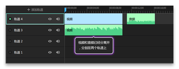 3、可以看到,視頻和音頻已經(jīng)分離開,分別在兩個軌道上,可以分別進行剪輯,如圖所示: