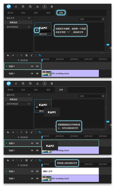 1、選擇某一個軌道,切換到文字面板,點擊文字的“+”,或者直接拖拽文字到軌道,可以看到,文字成功添加到軌道上,如圖下所示: