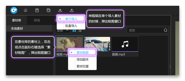 一、神剪輯粗剪怎么用?1、在素材庫窗口粗剪素材的方法。在素材庫的素材上,雙擊或點擊鼠標右鍵選擇“素材粗剪”,或者在單個導(dǎo)入素材的時候,都可彈出該素材對應(yīng)的粗剪窗口,如圖所示: