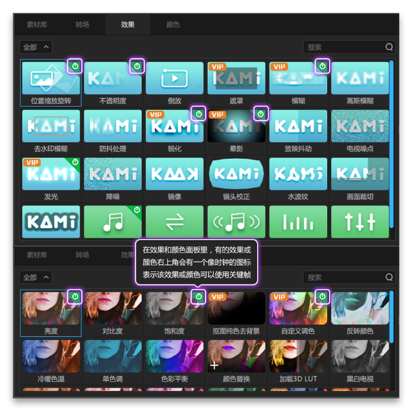 1、神剪輯的關(guān)鍵幀編輯是要配合顏色或效果使用的。在效果和顏色面板里,有的效果或顏色右上角會有一個像時鐘的圖標,表示該效果或顏色可以使用關(guān)鍵幀。