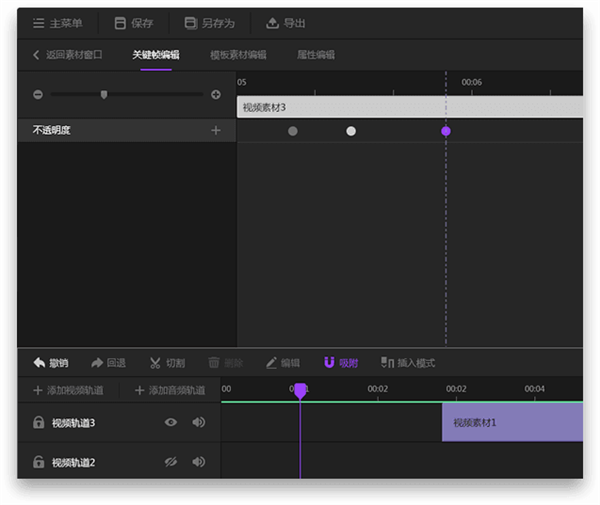 2、選擇素材,添加可以編輯關(guān)鍵幀的效果或顏色,然后選擇軌道的素材,點擊編輯欄的“編輯”,來到關(guān)鍵幀編輯面板,在關(guān)鍵幀編輯面板中編輯效果或顏色的關(guān)鍵幀,拖動該圖標,可縮放關(guān)鍵幀編輯面板。