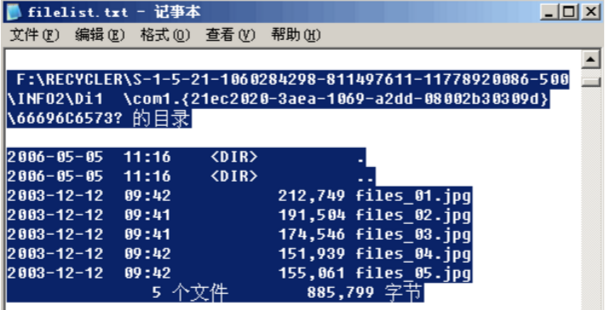 4、從前面生成的文件列表中,復(fù)制加密文件存放路徑,F(xiàn):\RECYCLER\S-1-5-21-1060284298-811497611-11778920086-500\INFO2\Di1\com1.{21ec2020-3aea-1069-a2dd-08002b30309d}\66696C6573?