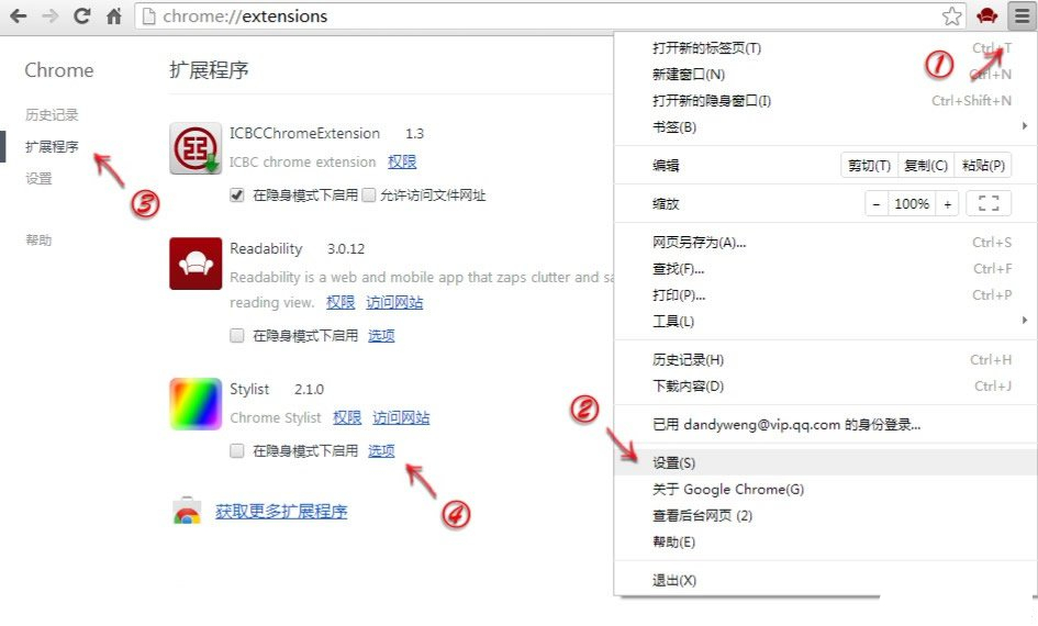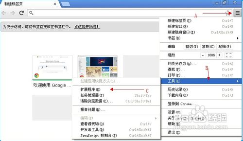 stylist插件怎么安裝?如圖,打開Chrome瀏覽器,依次點(diǎn)擊A->B->C進(jìn)入插件管理界面。