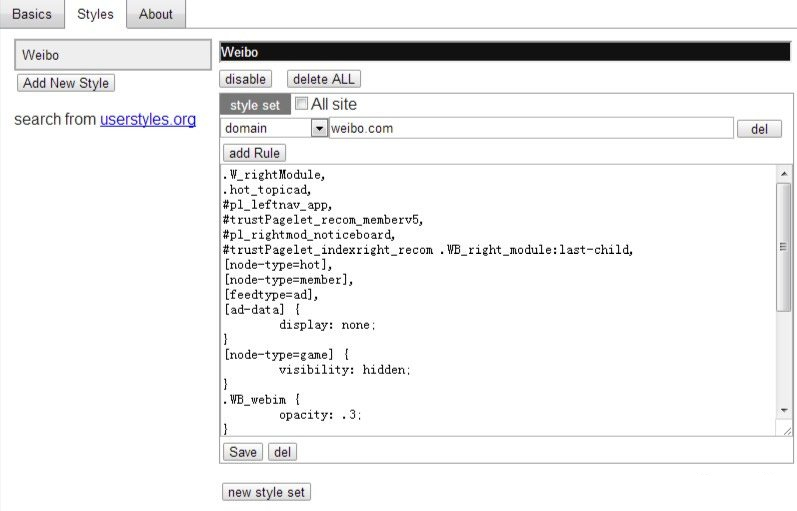 點(diǎn)擊選項(xiàng)卡中的 “Style” 頁簽,然后點(diǎn)擊 “Add New Style”;在頂部的黑色輸入框里輸入 “Weibo”;把 Style set 下方的下拉框選擇為 “domain”,在旁邊的輸入框里輸入 “weibocom”;將以下代碼復(fù)制到最大的文本框里,然后點(diǎn)擊 “Save” 保存。