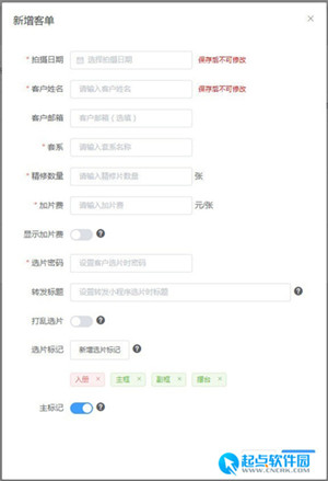 1、新增客單我們把云選片中的每一套客片稱為客單,即客戶訂單。客單管理中點(diǎn)擊新增客單,輸入 拍攝日期、客戶姓名、套系、精修數(shù)量、加片費(fèi)等信息,保存即可。注意:拍攝日期和客戶姓名在保存后不可再次修改。我們拋棄復(fù)雜的客單生成,一切化繁為簡(jiǎn),因?yàn)槟憧赡芤呀?jīng)有了客戶及訂單管理系統(tǒng)。