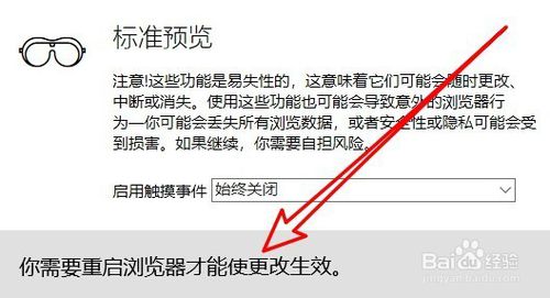 6、這時(shí)就會(huì)在edge瀏覽器頁面中看到需要重新啟動(dòng)瀏覽器后使設(shè)置生效的提示信息。待瀏覽器重新啟動(dòng)后,就可以使用edge瀏覽器的兼容模式了。