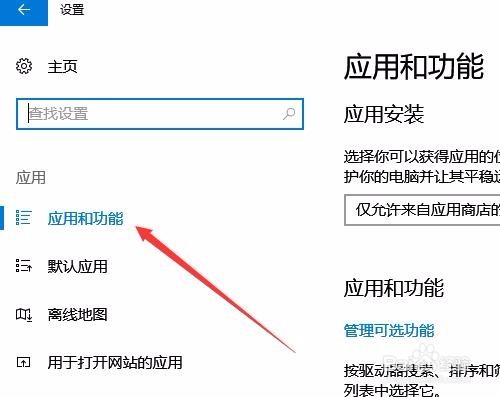 3、在打開的應(yīng)用設(shè)置窗口中,點(diǎn)擊左側(cè)邊欄的應(yīng)用和功能菜單項(xiàng)。