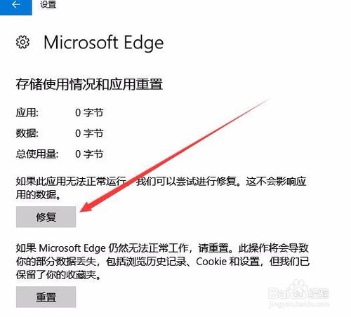 6、這時(shí)會(huì)打開edge瀏覽器的設(shè)置窗口,點(diǎn)擊修復(fù)按鈕,這時(shí)系統(tǒng)就會(huì)對(duì)edge瀏覽器進(jìn)行修復(fù)。