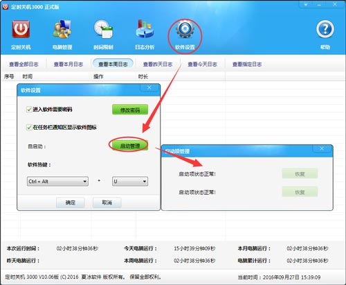 使用方法:打開(kāi)定時(shí)關(guān)機(jī)3000,點(diǎn)擊軟件窗口上方的“軟件設(shè)置”,然后點(diǎn)擊“啟動(dòng)管理”,在彈出的窗口中查看啟動(dòng)項(xiàng)狀態(tài)。