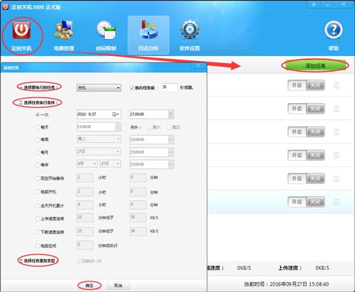 2)使用方法:打開(kāi)定時(shí)關(guān)機(jī)3000,點(diǎn)擊軟件窗口上方的“定時(shí)關(guān)機(jī)”,然后點(diǎn)擊“添加任務(wù)”。在彈出的“添加任務(wù)”窗口中,在“選擇要執(zhí)行的任務(wù)”后面的下拉菜單中,選擇需要執(zhí)行的任務(wù)。然后在“選擇任務(wù)執(zhí)行條件”中,有11種不同的執(zhí)行條件,可以根據(jù)自己的需要進(jìn)行設(shè)置。如果勾選“只執(zhí)行一次”,設(shè)置的任務(wù)執(zhí)行一次后就關(guān)閉,不再執(zhí)行。設(shè)置完成后,點(diǎn)擊“確定”。然后在彈出的對(duì)話框中點(diǎn)擊“是”,啟動(dòng)設(shè)置的任務(wù)。設(shè)置成功的任務(wù)會(huì)顯示在定時(shí)關(guān)機(jī)任務(wù)列表中。