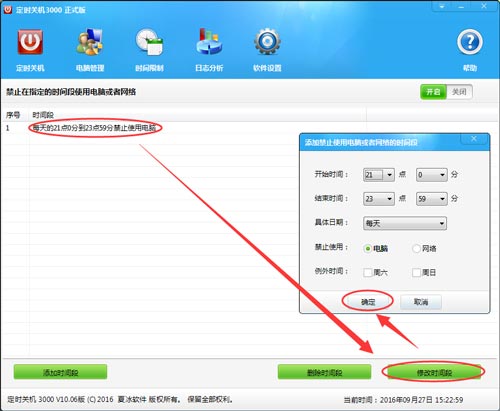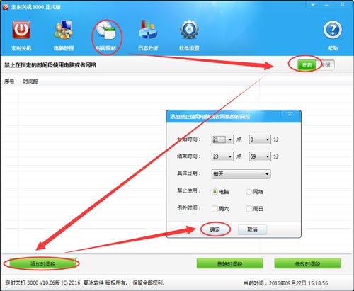 2)使用方法:打開(kāi)定時(shí)關(guān)機(jī)3000,點(diǎn)擊軟件窗口上方的“時(shí)間限制”,在彈出窗口的右上角開(kāi)啟“禁止在指定的時(shí)間段使用電腦或網(wǎng)絡(luò)”,然后點(diǎn)擊窗口左下角的【添加時(shí)間段】按鈕。設(shè)置任務(wù)的開(kāi)始時(shí)間、結(jié)束時(shí)間、具體日期和禁止使用的對(duì)象“電腦”或“網(wǎng)絡(luò)”,然后點(diǎn)擊“確定”。