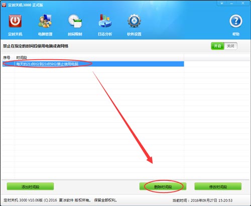 如需刪除時(shí)間段:打開(kāi)軟件,點(diǎn)擊“時(shí)間限制”,然后在列表框中選擇需要?jiǎng)h除的時(shí)間段,然后點(diǎn)擊窗口下方的“刪除時(shí)間段”按鈕。