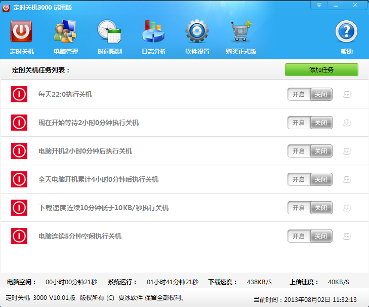 定時(shí)關(guān)機(jī)3000正式版全部功能都是開(kāi)放的并且沒(méi)有任何限制,一次購(gòu)買,永久使用,終身免費(fèi)升級(jí)和享有完善的技術(shù)支持和售后服務(wù)。