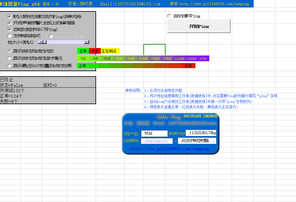 本工具運行于Excel下,主要作用是對網(wǎng)絡連通情況進行批量檢測、監(jiān)測等(即:批量ping ip地址)。具有錄入信息方便無須轉換、批量檢查速度奇快、檢測結果顯示直觀明了、操作簡單易用、使用方便無須安裝等特點。