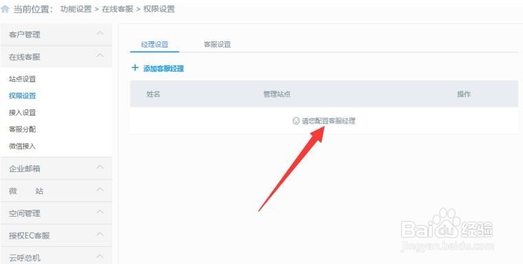 選擇“經(jīng)理設置”顯示客服經(jīng)理列表,列表中顯示“姓名”“管理站點”“操作”等字段,列表在初始時為空,提示請您配置客服經(jīng)理,如圖所示