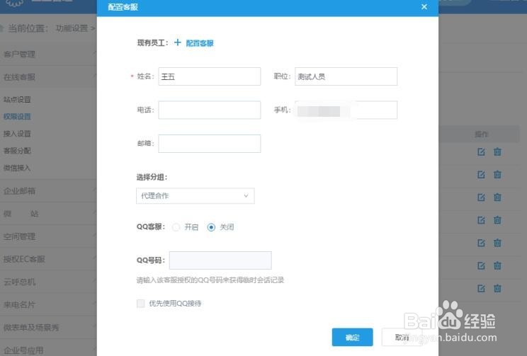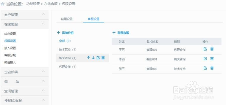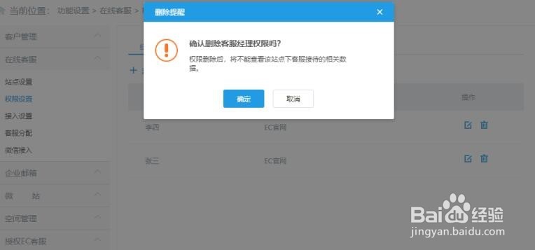 當你決定要刪除某個客服的權限的時候,點擊“操作”中“刪除”按鈕即可,刪除后,該人將不能再看到相關的數(shù)據(jù)信息了。