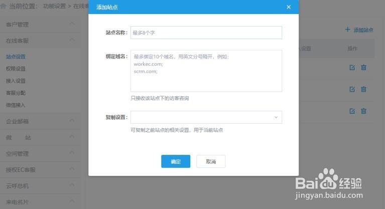 點擊“添加站點”即可,命名可以輸入16個字符,最多可以綁定10個不同的域名,綁定后只接收該站點下的訪客咨詢!
