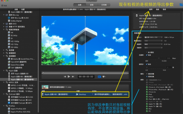 需要注意的是雖然蘋(píng)果的預(yù)設(shè)值不允許更改但是如果你拖入了視頻中,作為導(dǎo)出參數(shù),你能選中這個(gè)視頻,對(duì)這個(gè)視頻的具體參數(shù)進(jìn)行修改。如圖: