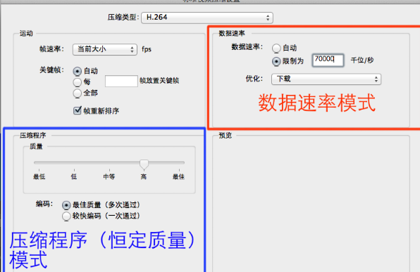 【壓縮程序】和【數(shù)據(jù)速率】只能二選一:【壓縮程序】是恒定質(zhì)量的算法,類似于X264編碼器的crf值,根據(jù)質(zhì)量分配適合的碼率,最終生成的大小不可預(yù)見(jiàn)?!緮?shù)據(jù)速率】是恒定最終生成的視頻大小,但是質(zhì)量不可預(yù)見(jiàn)。當(dāng)【數(shù)據(jù)速率】選擇“自動(dòng)”的時(shí)候就是恒定質(zhì)量算法,當(dāng)【數(shù)據(jù)速率】選擇“限制為*****千位/秒”則行進(jìn)恒定大小算法。