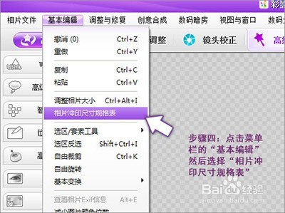 接下來(lái)為避免圖片被拉伸打印,我們可以先使用彩影自帶的沖印尺寸規(guī)格裁剪功能。點(diǎn)擊最頂部菜單欄的“基本編輯”,選擇“相片沖印尺寸規(guī)格表。