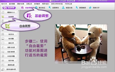 我們可以通過(guò)點(diǎn)擊軟件頂部導(dǎo)航欄的“基礎(chǔ)調(diào)整”,然后使用左邊面板的“自由裁剪”按鈕來(lái)裁剪照片。