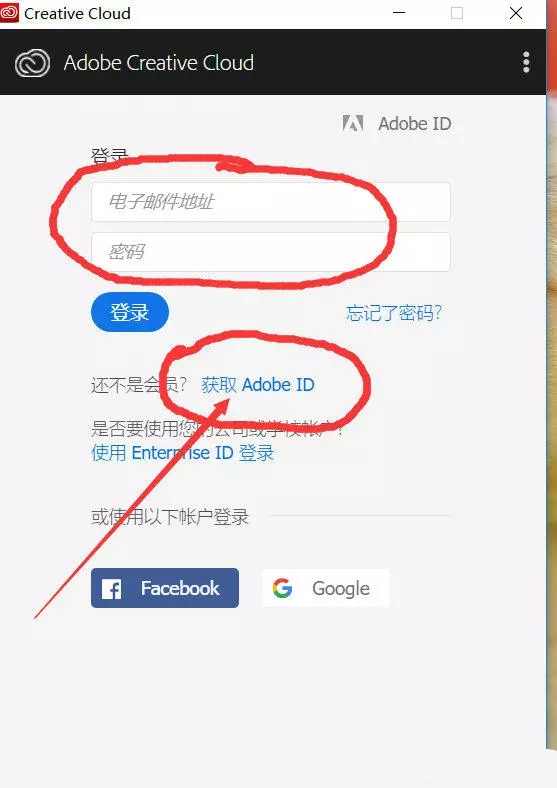 這一步,就是對于很多沒有過軟件的小伙伴,是一個難題,為什么要登錄賬號呢?就像你用微信一樣,你還要注冊微信賬號,是同一個道理的。如果你沒有,你就點擊獲取AdobeID,注冊一個。至于用過Adobe公司軟件的,肯定是有賬號的,直接登錄就可以了