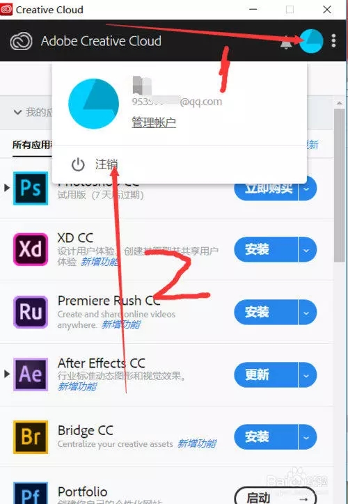 第三步:非常關鍵,在我們完成替換之后,就可以關閉所有界面了,這個時候也不要打開軟件去查看還有沒有試用期7天的顯示了。關鍵點:接著我們再去打開Adobe Creative Cloud云工具,把AdobeID賬號注銷掉就可以了,如下圖,打開之后注銷掉。