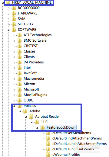 依次點擊打開“[HKEY_LOCAL_MACHINE\SOFTWARE\Policies\Adobe\Acrobat Reader\11.0\FeatureLockDown]”。