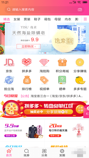 1.品類豐富:服飾、電器、居家、美妝、母嬰、水果全覆蓋,專注于找到最合適你的商品。2.任性包郵:9塊9也包郵,實惠多多。