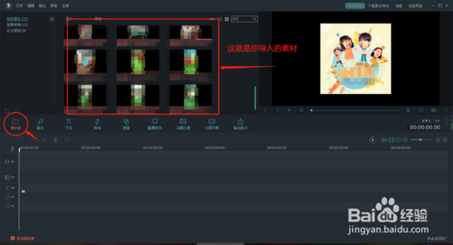 1、把視頻素材導(dǎo)入到了軟件之后,點(diǎn)擊素材,上面有個+。